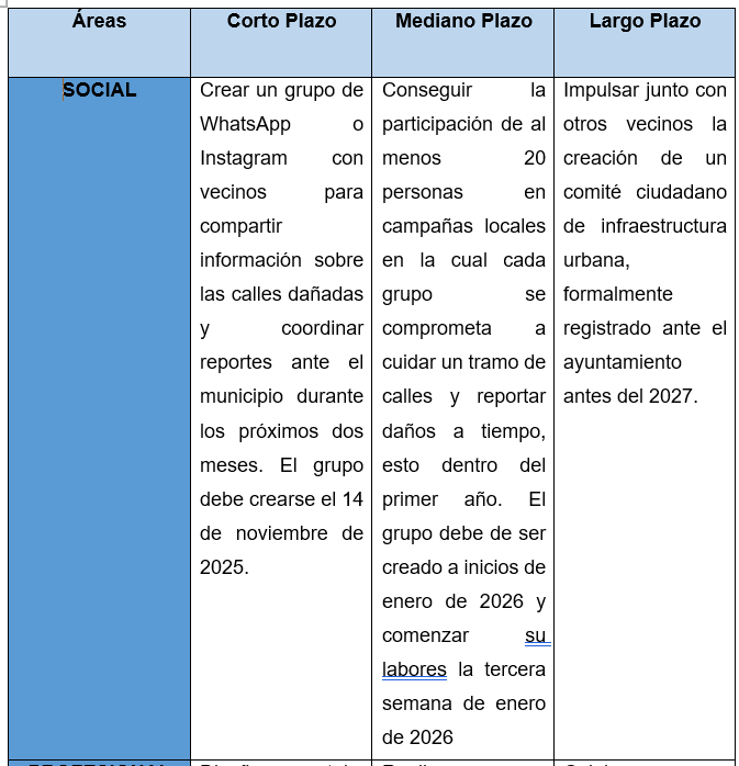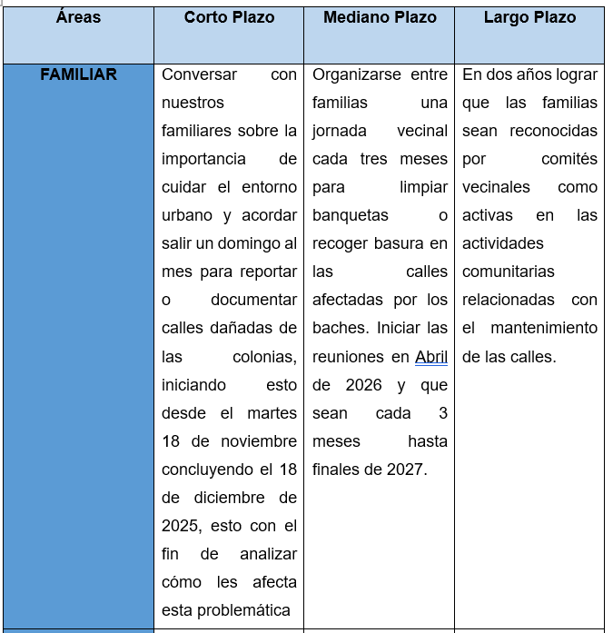 Promover la cultura de mantenimiento vial mediante acciones comunitarias, proyectos escolares y campañas informativas fomentando la participación ciudadana y la colaboración con autoridades locales para mejorar la infraestructura urbana e impulsar la conciencia colectiva sobre la importancia de cuidar y reportar los daños en las vías públicas.